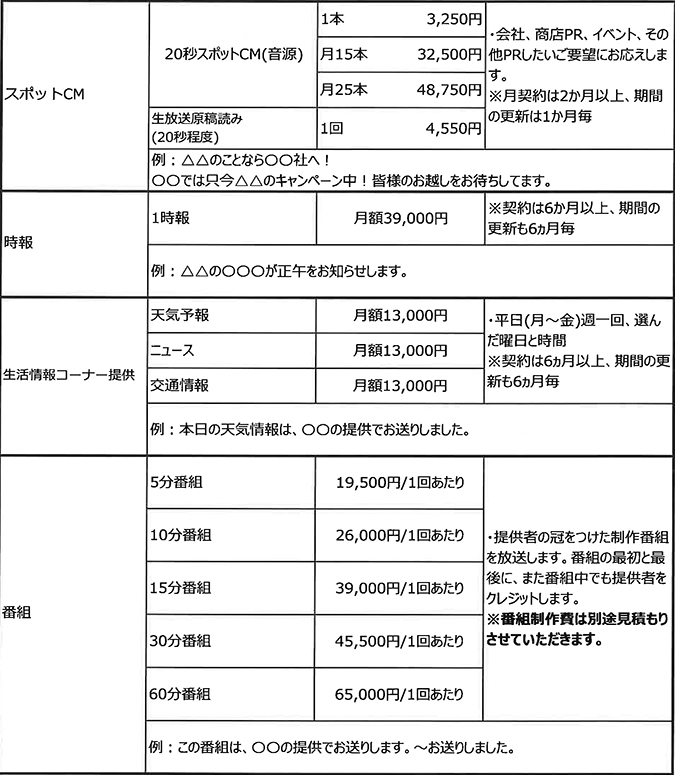 ラジオ放送CM・番組料金表のデータは、以下からPDFでご覧頂くことができます。 |